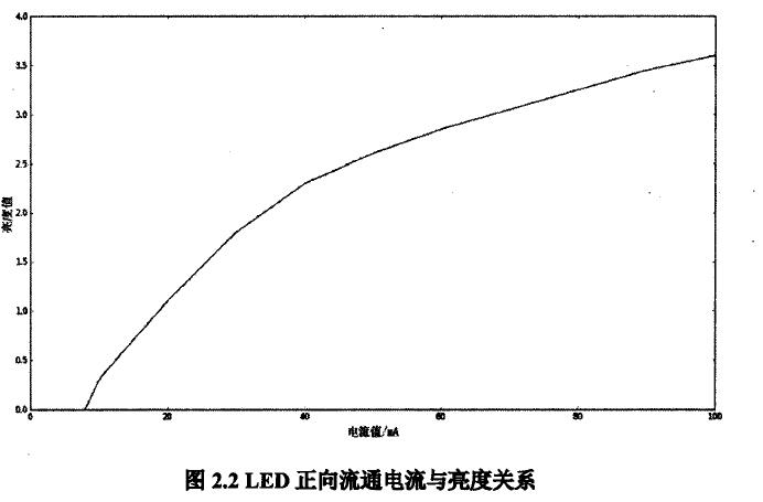 當(dāng)在LED加上正向電壓之后,PN結(jié)導(dǎo)通,LED發(fā)光。除了某些紅色LED 有飽和現(xiàn)象之外,LED的亮度基本與流過(guò)其電流的大小正比,圖2.2為某廠家生 產(chǎn)的紅色LED電流與亮度曲線圖心10]。
