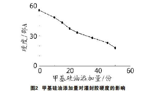 由圖2、圖3可以看出,隨著甲基硅油添加量的增加,灌封膠的硬度和膠料混合黏度不斷降低。這是由于甲基硅油在配方體系中起2個(gè)作用: 1)稀釋劑,在不增大交聯(lián)劑、催化劑配比前提下,增大硫化劑的表觀質(zhì)量,同時(shí)又可降低膠料黏度,有利于施工; 2)增塑劑,甲基硅油是以Si-0-Si為主鏈,甲基為側(cè)鏈的線型有機(jī)硅聚合物,可使硅橡膠分子鏈容易滑動從而降低灌封膠的硬度。