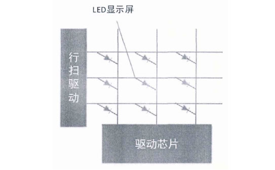 具體而言,主控制器從PC顯示卡處獲取屏幕中各像素的灰度數(shù)據(jù),然后分配給若干塊掃描板,掃描板則控制液晶拼接屏上的若干行,而每一行上的顯示信號則通過本行的各個顯示控制單元用串行方法級聯(lián)傳輸,每個顯示控制單元都直接面向液晶拼接屏。液晶拼接屏的顯示信息由行驅(qū)動和列驅(qū)動共同控制,其中驅(qū)動芯片的作用就是控制列信號電流的通斷,當驅(qū)動芯片控制列信號通斷時,行掃芯片也控制著行信號的通斷,從而顯示出每個像素所需的灰度數(shù)據(jù)。如下圖所示,為液晶拼接屏驅(qū)動示意圖。