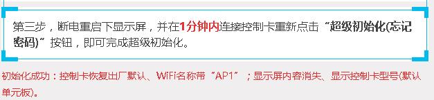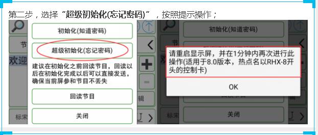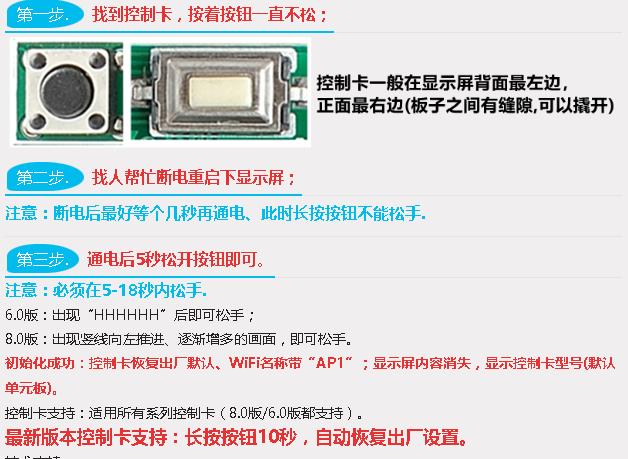 近來(lái)led顯示屏采用了瑞合信控制卡的都需要密碼,只有部改過(guò)顯示屏內(nèi)容的手機(jī)才能操作。如果找不到先前操作的人,只能讓控制卡恢復(fù)出廠設(shè)置,初始化控制卡密碼。然后再修改密碼。下面介紹操作的兩種方法: